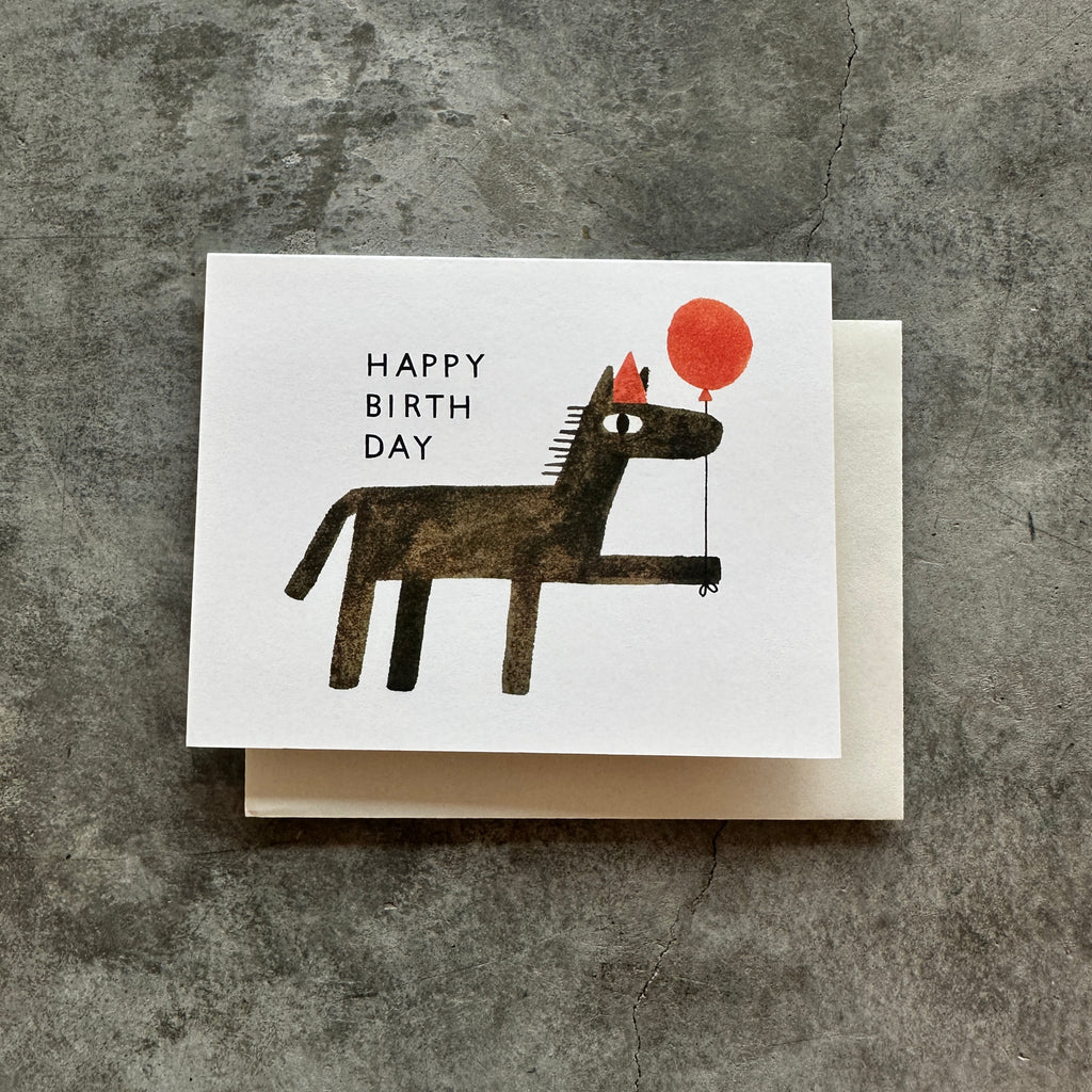 Celebrate in style with this delightful birthday card featuring Jon Klassen's charming illustration of a cheerful horse sporting a vibrant red party hat and clutching a matching red balloon. Perfect for horse lovers and art enthusiasts alike, this whimsical design brings joy and personality to any birthday greeting. Klassen's signature artistic style shines through in every detail, making this card a memorable keepsake your recipient will treasure.