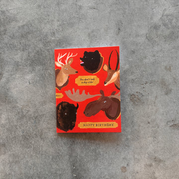 Celebrate birthdays with a wink using this Taxidermy Birthday Card. Featuring a cheeky display of mounted animal heads—deer, moose, bison, bear, and antelope—each humorously labeled beneath the bold message “YOU DON’T LOOK A DAY OLDER.” Reminiscent of a vintage hunting lodge, it’s perfect for those who appreciate quirky humor and the great outdoors. This playful card is sure to stand out and bring a smile, making any birthday a little more memorable.